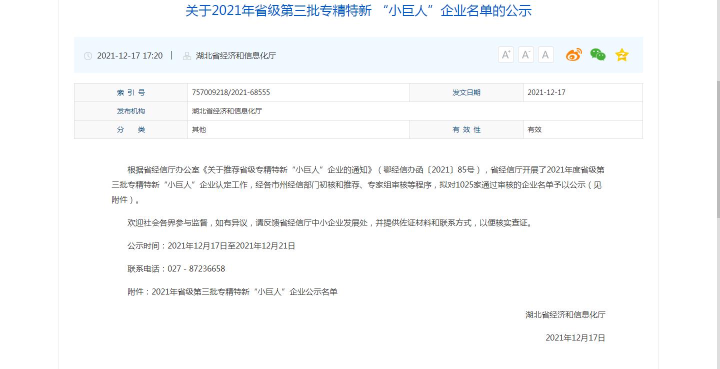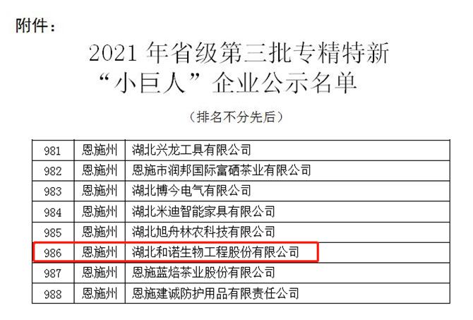 近日,湖北省經(jīng)濟和信息化廳公布了2021年度省級第三批專精特新小巨人企業(yè)名單,湖北和諾生物工程股份有限公司成功入選,這標志著和諾生物在專精特新、創(chuàng)牌提質(zhì)工作方面的又一創(chuàng)新突破。
